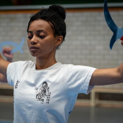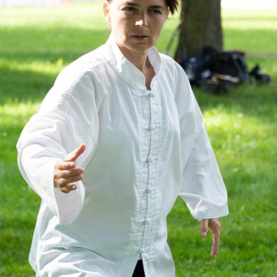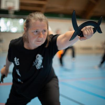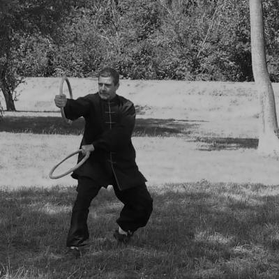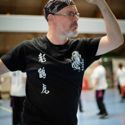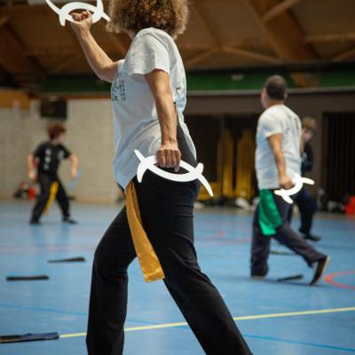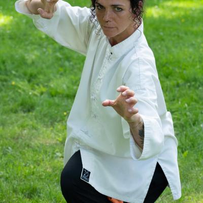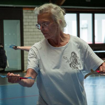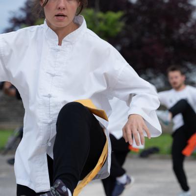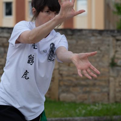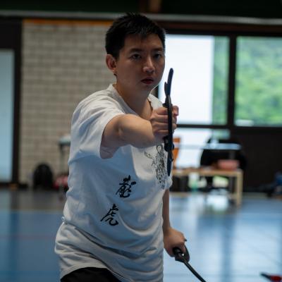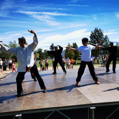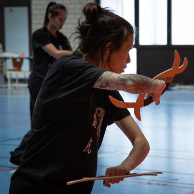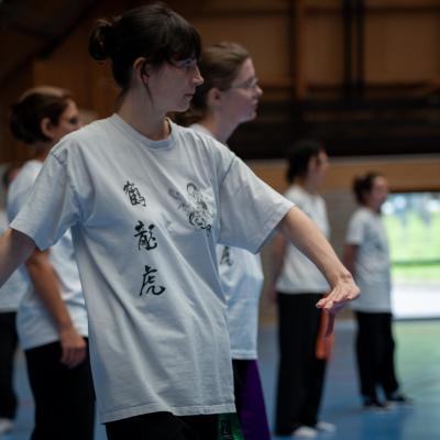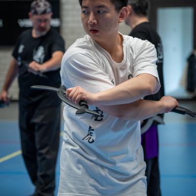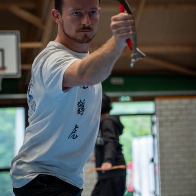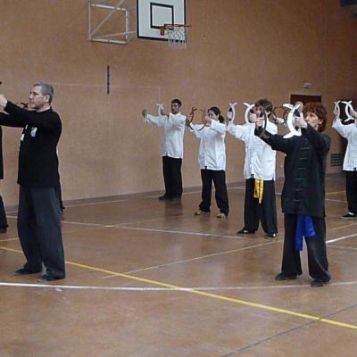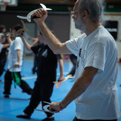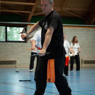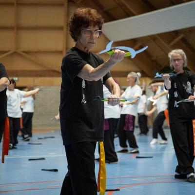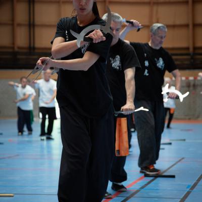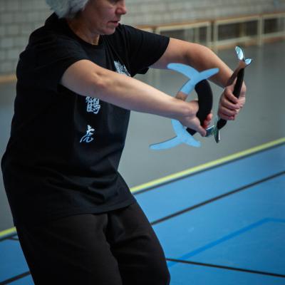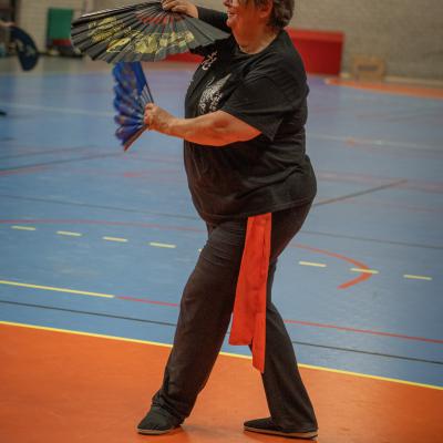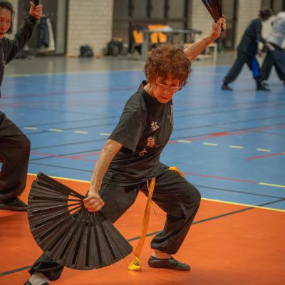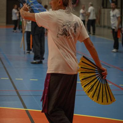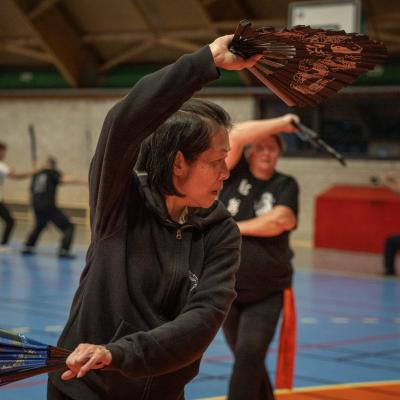 Entraînement avec l'éventail (Shan en Chinois, Tessen en Japonais), arme de combat en acier à l'origine, il était plutot utilisé par la caste des nobles. L'éventail fait partie des armes courtes et il pouvait être pointu aux lames acérées, il est possible de le lancer à l'occasion. Aujourd'hui utilisé dans les "Tao Lu" (ensemble de techniques et de mouvements liés à l'art pratiqué, se travaille mains nues ou avec armes traditionnelles, sert à l'entraînement ou à la démonstration, un peu comme un combat imaginaire contre un ou plusieurs adversaires supposés - Kata en Japonais, Poomse en Coréen, Quyen en Vietnamien). De nos jours fait de lames de bambou très solides, l'éventail sert d'arme d'entraînement ou de démonstration, le bruit, claquant, caratéristique lors de l'ouverture ou de la fermeture sert à ponctuer les mouvements mais également lors d'un combat, à surprendre un adversaire en lui faisant fermer les yeux de surprise par exemple. L'éventail est utilisé dans les enchaînements de Tai Chi Chuan et de Kung Fu