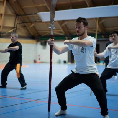 Les cours et stages comprennent : L'enseignement théorique et philosophique, l'entraînement physique seul (e) ou à plusieurs, avec les mains nues et/ou avec les multiples armes traditionnelles (comme épée, sabre, éventail, bâton long et court, hallebarde, etc.)