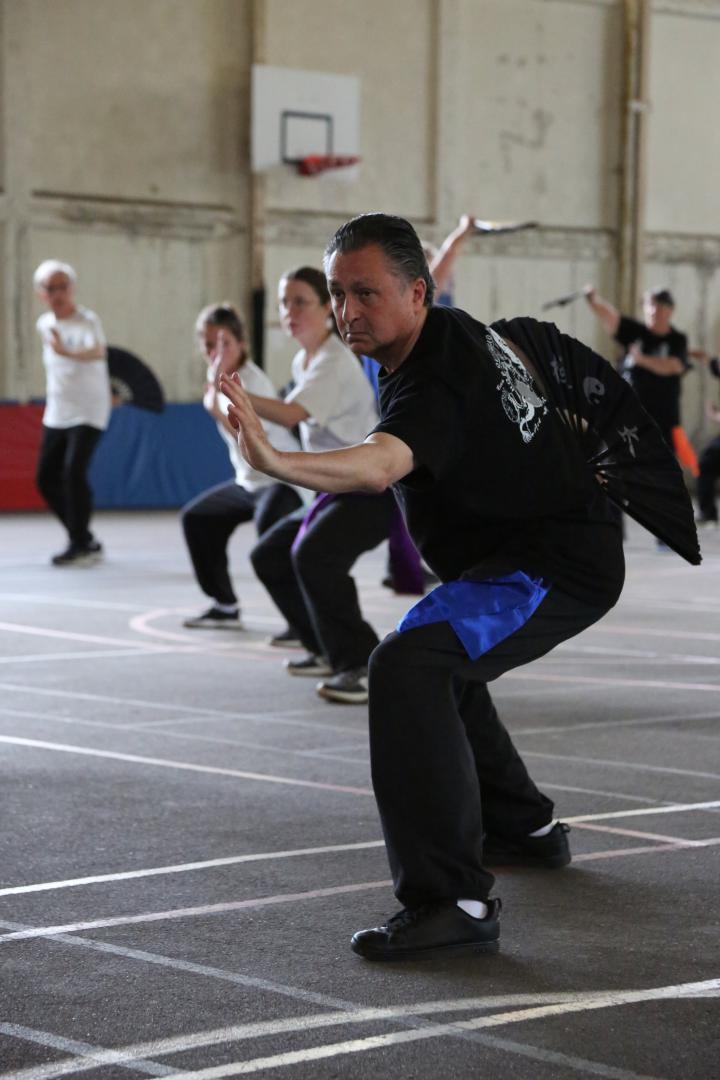 Entraînement avec l'éventail (Shan en Chinois, Tessen en Japonais), arme de combat en acier à l'origine, il était plutot utilisé par la caste des nobles. L'éventail fait partie des armes courtes et il pouvait être pointu aux lames acérées, il est possible de le lancer à l'occasion. Aujourd'hui utilisé dans les "Tao Lu" (ensemble de techniques et de mouvements liés à l'art pratiqué, se travaille mains nues ou avec armes traditionnelles, sert à l'entraînement ou à la démonstration, un peu comme un combat imaginaire contre un ou plusieurs adversaires supposés - Kata en Japonais, Poomse en Coréen, Quyen en Vietnamien). De nos jours fait de lames de bambou très solides, l'éventail sert d'arme d'entraînement ou de démonstration, le bruit, claquant, caratéristique lors de l'ouverture ou de la fermeture sert à ponctuer les mouvements mais également lors d'un combat, à surprendre un adversaire en lui faisant fermer les yeux de surprise par exemple. L'éventail est utilisé dans les enchaînements de Tai Chi Chuan et de Kung Fu