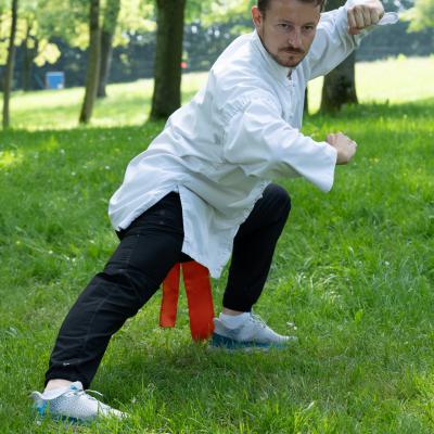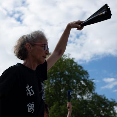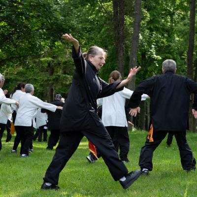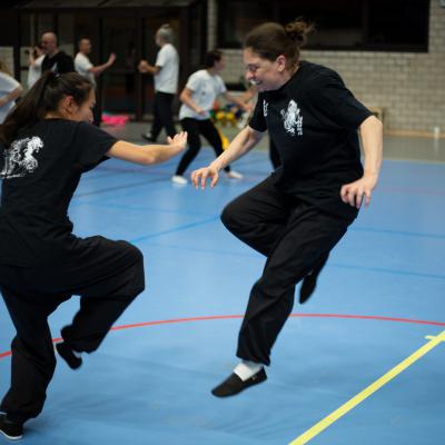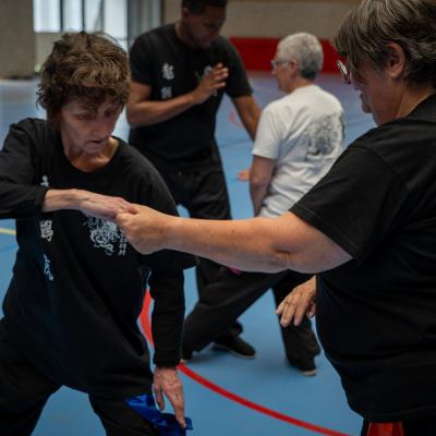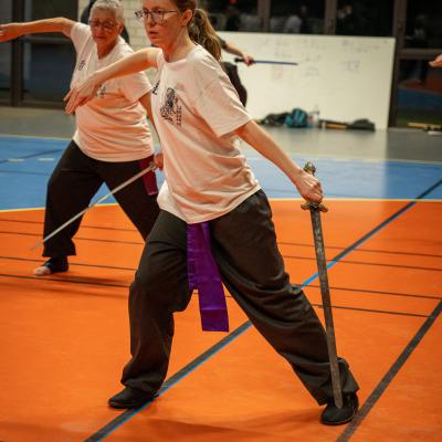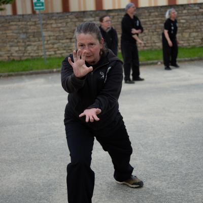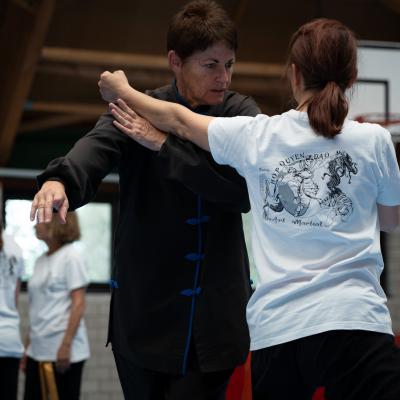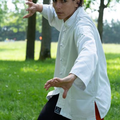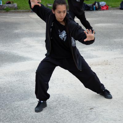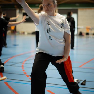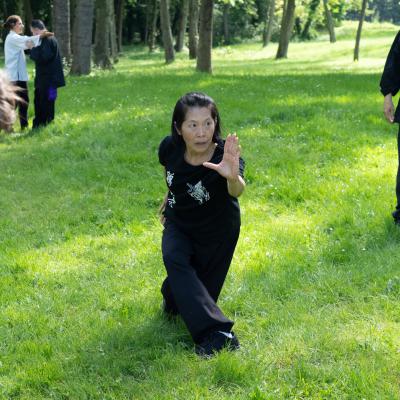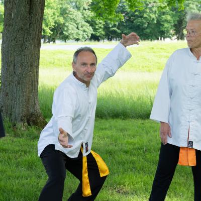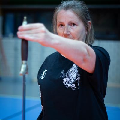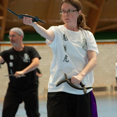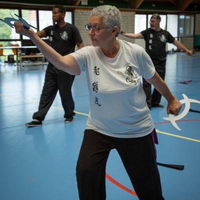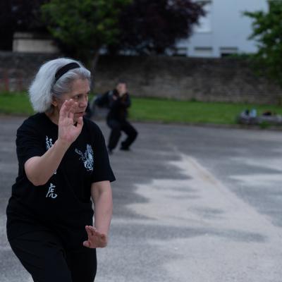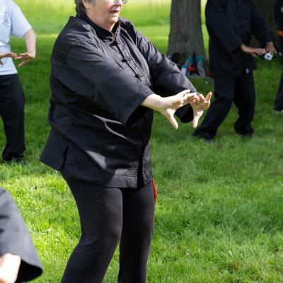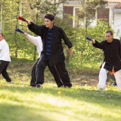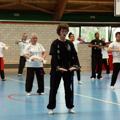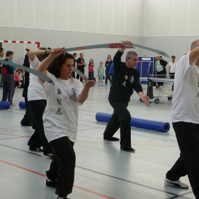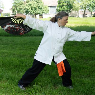 Entraînement avec l'éventail (Shan en Chinois, Tessen en Japonais), arme de combat en acier à l'origine, il était plutot utilisé par la caste des nobles. L'éventail fait partie des armes courtes et il pouvait être pointu aux lames acérées, il est possible de le lancer à l'occasion. Aujourd'hui utilisé dans les "Tao Lu" (ensemble de techniques et de mouvements liés à l'art pratiqué, se travaille mains nues ou avec armes traditionnelles, sert à l'entraînement ou à la démonstration, un peu comme un combat imaginaire contre un ou plusieurs adversaires supposés - Kata en Japonais, Poomse en Coréen, Quyen en Vietnamien). De nos jours fait de lames de bambou très solides, l'éventail sert d'arme d'entraînement ou de démonstration, le bruit, claquant, caratéristique lors de l'ouverture ou de la fermeture sert à ponctuer les mouvements mais également lors d'un combat, à surprendre un adversaire en lui faisant fermer les yeux de surprise par exemple. L'éventail est utilisé dans les enchaînements de Tai Chi Chuan et de Kung Fu