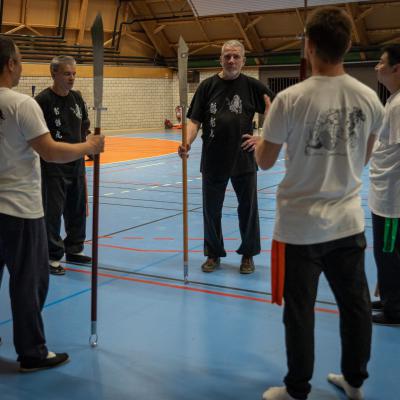 Les cours et stages comprennent : L'enseignement théorique et philosophique, l'entraînement physique seul (e) ou à plusieurs, avec les mains nues et/ou avec les multiples armes traditionnelles (comme épée, sabre, éventail, bâton long et court, hallebarde, etc.)
